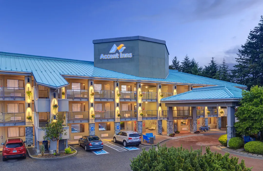 Accent Inns Kelowna features 102 spacious accommodations across three floors, including single rooms, suites, and wheelchair accessible options. Rooms include air conditioning, coffee/tea makers, hair dryers, and some offer kitchenettes. Free WiFi is available throughout the hotel.