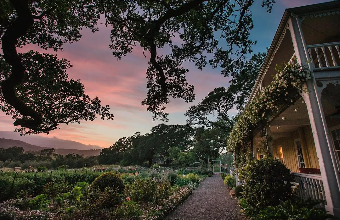 Dining options feature meals primarily sourced from the estate's garden and orchard, including a ranch-grown breakfast under ancient oak trees. Unique culinary experiences are available, created by Estate Chef Neil Corsten and highlighted by vineyard wine pairings.