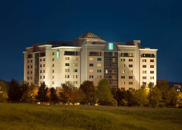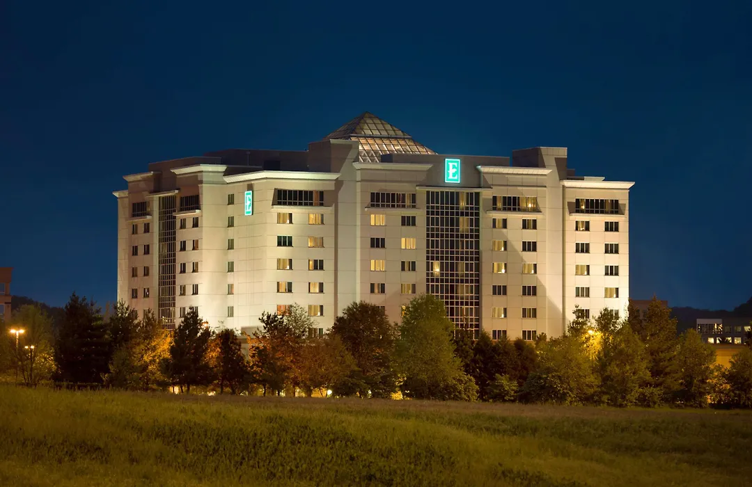 Rooms at Embassy Suites feature premium bedding, air conditioning, and separate sitting areas, with some suites offering sofa beds and dining areas. Each room includes a flat-screen TV, laptop-compatible safe, and private bathrooms with designer toiletries.