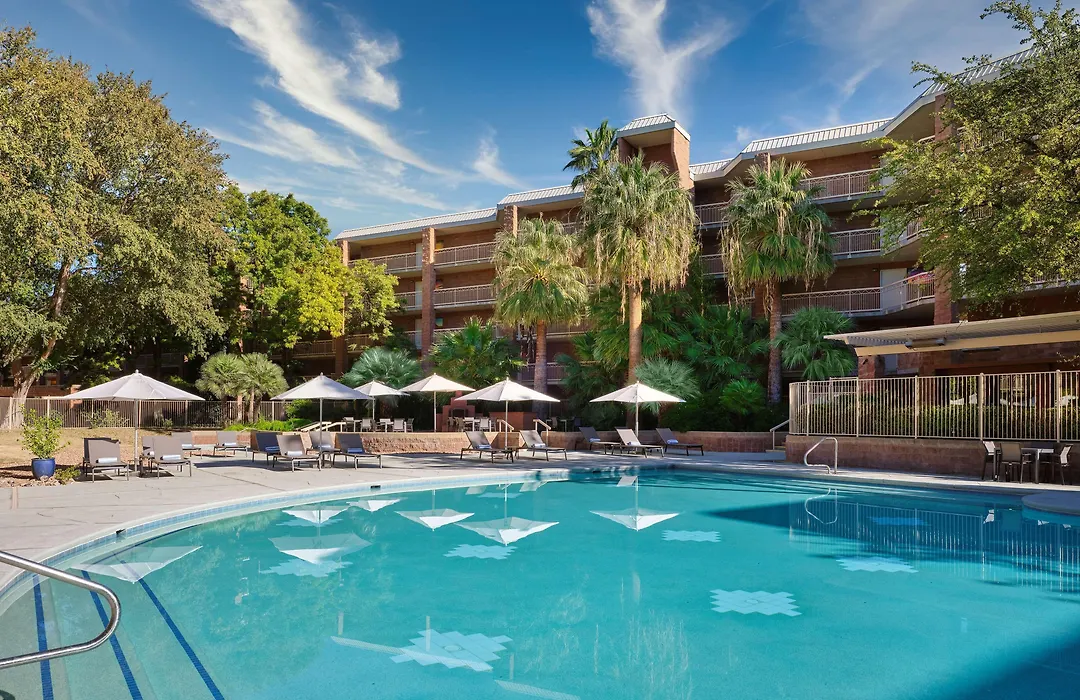 Embassy Suites provides recreational facilities including a fitness center, hot tub, and outdoor landscaped pool area. Guests can enjoy the tranquil garden and terrace for relaxation. The nearby Randolph North Golf Course and Dell Urich Golf Course are also popular options for those seeking outdoor activities.