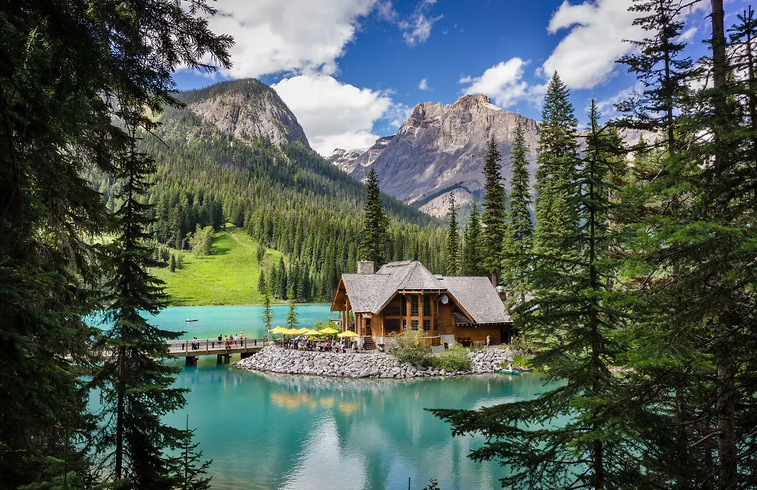 Emerald Lake Lodge features 24 cabin-style buildings that accommodate up to 200 guests, reflecting traditional architecture and offering a range of room types, such as Lake View Rooms with king-size beds and private balconies overlooking the lake. Amenities include a cozy fireplace in most rooms and select pet-friendly options.