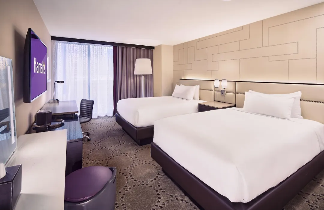 Rooms at Harrah'S Las Vegas include two queen beds, accommodating families traveling with children. Each room features a marble bathroom, a seating area, and a 42-inch cable HDTV with pay-per-view movies. Select rooms offer views of the Las Vegas Strip.
