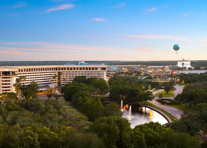 Hilton Orlando Lake Buena Vista provides extensive meeting and event space, accommodating over 2000 guests. The hotel is also located within walking distance of Disney Springs(R), accessible via a pedestrian skybridge.