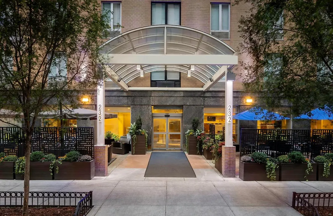 The hotel offers a free Express Start Breakfast Bar with hot entrees available daily. Nearby dining options include Tick Tock Diner NY and Shake Shack, both within a kilometer. A landscaped outdoor patio provides additional seating for guests.