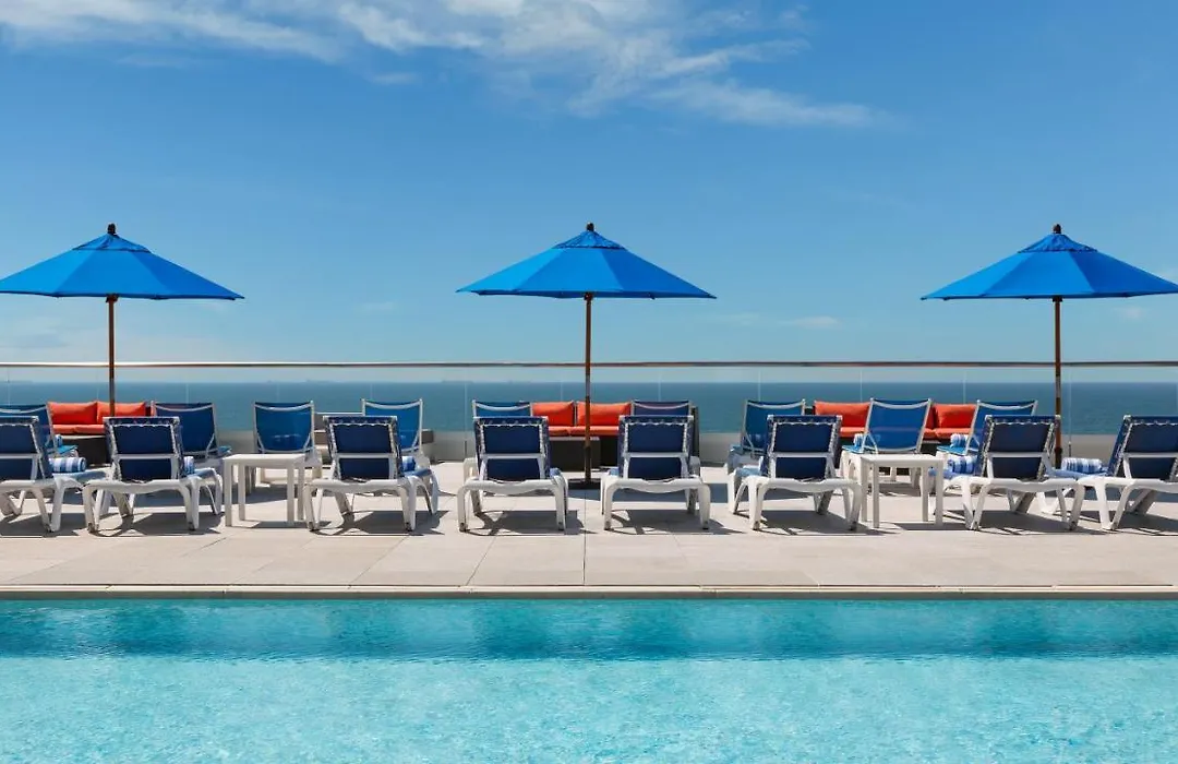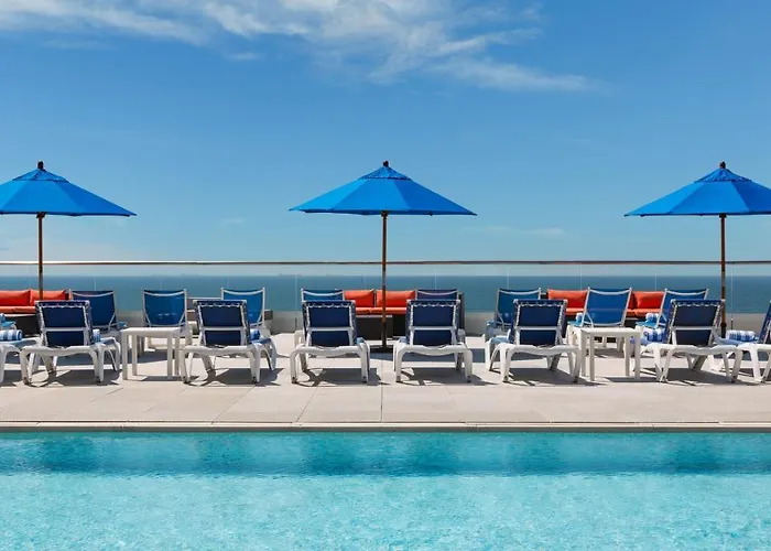 The hotel provides leisure facilities including a rooftop infinity pool and a fitness center with panoramic ocean views. Guests can explore nearby attractions like the Long Beach Boardwalk and Ocean Beach Park for outdoor activities.