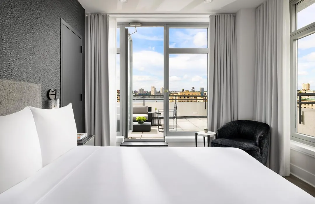 Rooms at Arthouse Hotel range from standard options to spacious lofts, many featuring private balconies with views of the Hudson River or Central Park. Each room includes wood flooring, 42" flat-screen HD televisions, and Keurig coffee makers. Junior Suites are available for families, accommodating up to four guests with two queen beds in approximately 450 square feet.