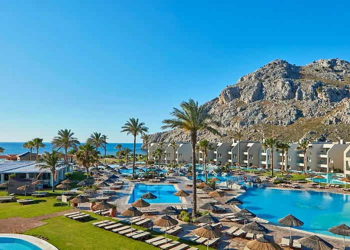 Atlantica Aegean Blue, an 8.8/10 rated 5-star Kolymbia hotel, features a beachfront location with direct access to the crystal-clear Aegean Sea. Guests can enjoy a variety of dining options, a water park, and recreational activities designed for families and individuals alike.