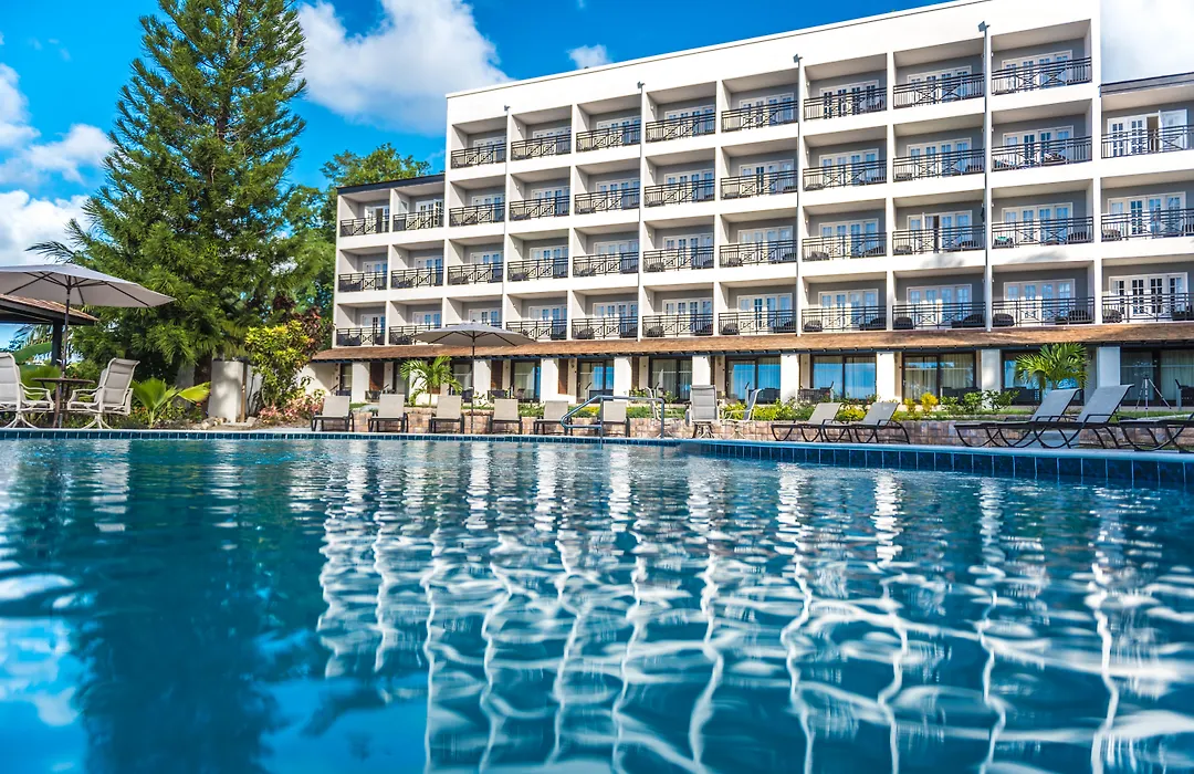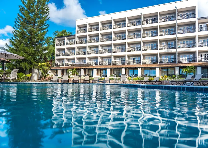 On-site dining includes the Verandah Restaurant, serving local Creole cuisine with buffet and à la carte options, and a coffee shop. Guests also have access to three bars, one located on the rooftop for elevated dining and cocktails. The hotel emphasizes fresh, local produce for an authentic culinary experience.