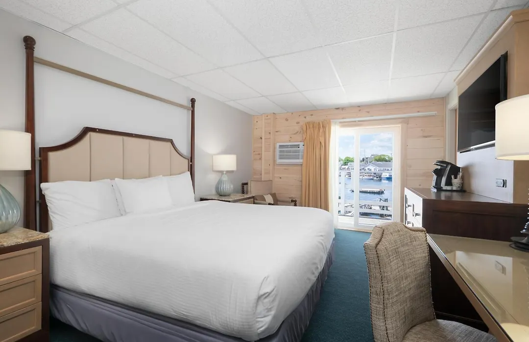 Rooms at Boothbay Harbor Inn include private bathrooms with personal amenities, 42-inch flat-screen TVs, refrigerators, and microwaves. Deluxe accommodations provide scenic waterfront views and most rooms feature private balconies, perfect for enjoying sunsets over the harbor.