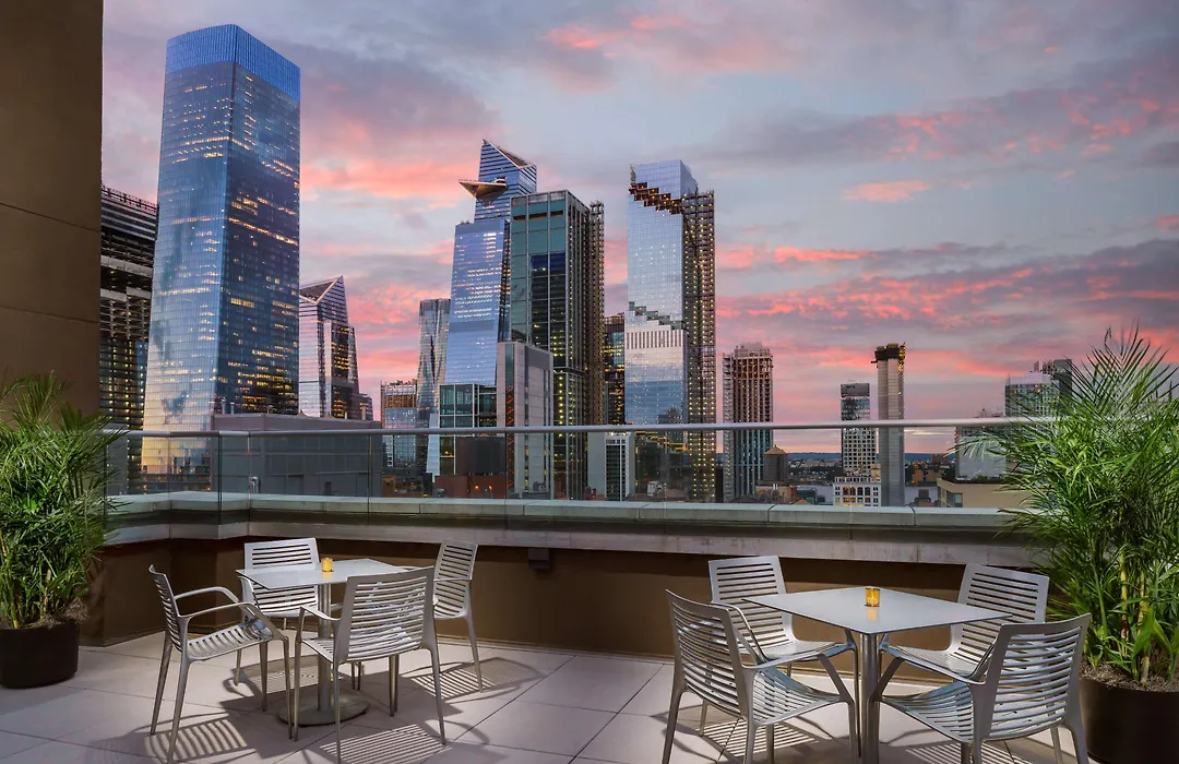 The hotel features a fitness center for guests. Nearby attractions include Times Square, Bryant Park, and The High Line, with easy access to public transportation including subway stations and bus routes.