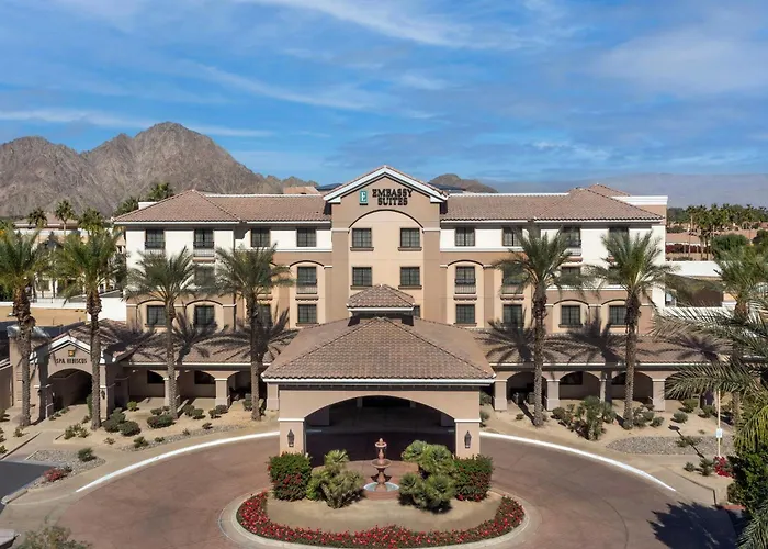 Embassy Suites La Quinta Hotel & Spa, a 4-star hotel rated 8.9/10 on Booking.com, features spacious suites with separate living areas and a full-service spa. The hotel offers a free made-to-order breakfast, an outdoor pool, and pet-friendly accommodations.