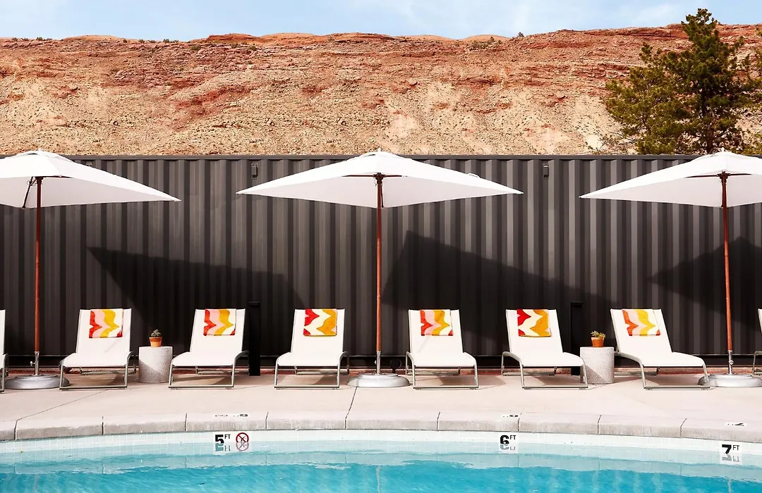 Field Station Moab features outdoor amenities including a pool and designated Van Life posts with power hookups. Nearby attractions such as Arches National Park and Canyonlands National Park offer outdoor recreational opportunities.