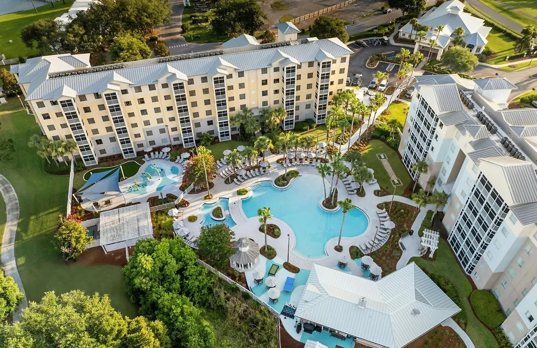 On-site leisure options include a zero-entry heated pool, a children's splash pad, a fitness center, and well-maintained grounds with tropical landscaping. Nearby attractions include St. Andrew State Park and Gulf Lagoon Beach, offering opportunities for beach days and outdoor activities.