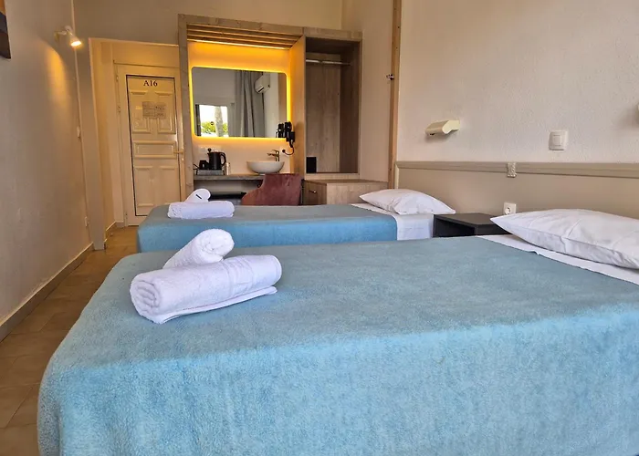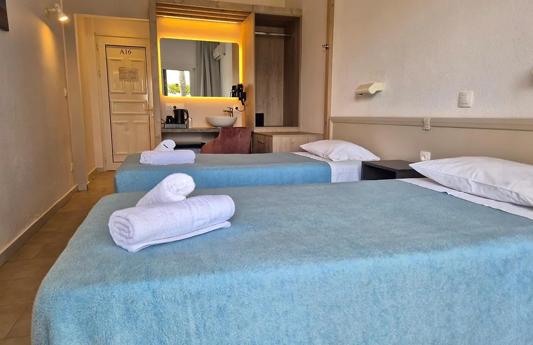 The hotel provides 24-hour front desk service, luggage storage, and car hire options. It is located 100 meters from the beach, with easy access to nearby nightlife and local attractions like Aqua Park Kavos.