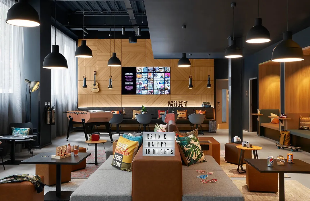Moxy Milton Keynes features a business center, vending machines with drinks and snacks, and activities like skiing and cycling in the surrounding area. The hotel also includes a nightclub and a 24-hour front desk.