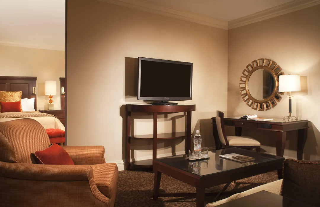 Accommodations at Omni William Penn Hotel range from deluxe rooms to luxurious suites, each featuring rich cherry wood furnishings and modern amenities. Some rooms offer roll-in showers and adjustable hand-held showerheads for accessibility, ensuring comfort and convenience for all guests.