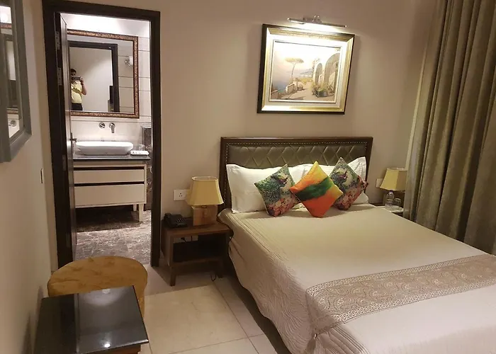 The hotel features 16 rooms and suites, including deluxe, super deluxe, and luxury accommodations. Each room is equipped with hot/cold air conditioning, a flat-screen TV, a fridge, and an attached bathroom with hot and cold shower facilities.