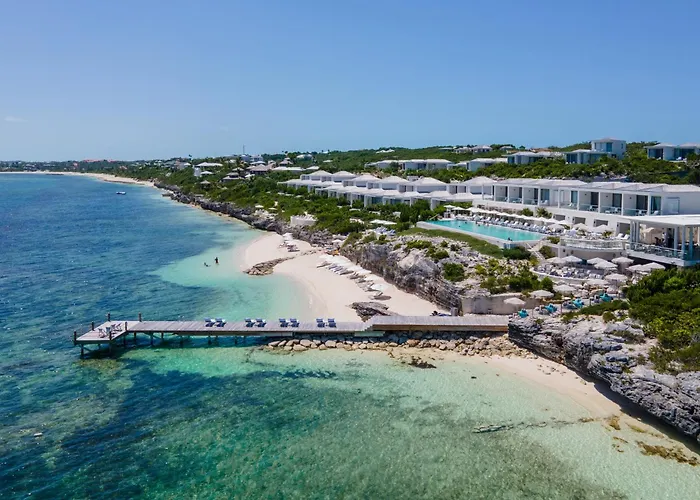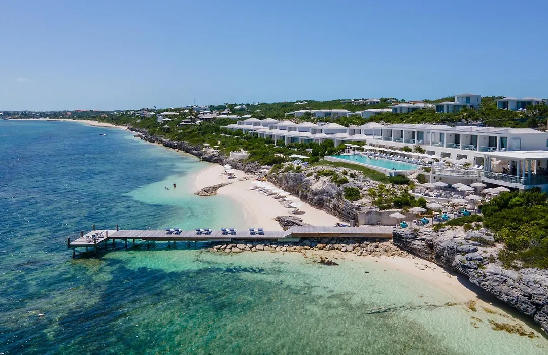 Rock House, a 5-star Turtle Cove hotel with a 9.3/10 rating on Booking.com, features an oversized 100-foot infinity edge pool and a dramatic secluded beach. This private resort includes 46 distinct accommodations, a beach club, and an array of dining options.