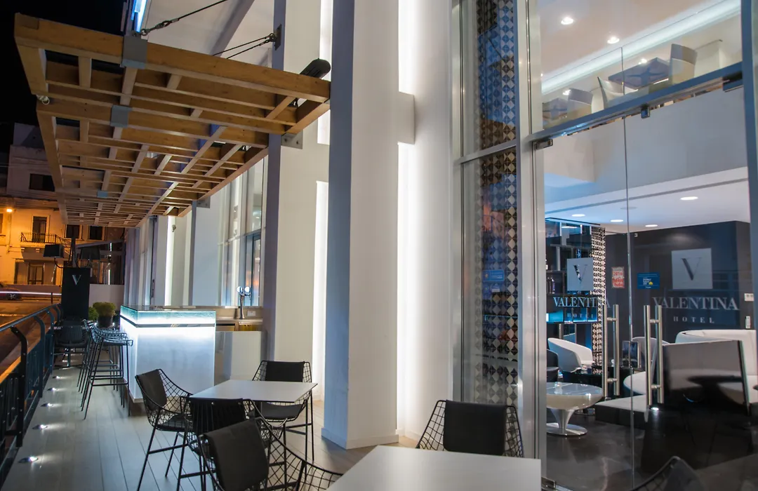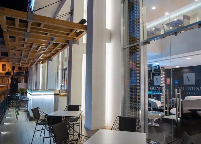Leisure activities at Hotel Valentina include a rooftop pool and a lounge bar with a glass-panelled bar overlooking an outdoor terrace. The library corner in the lobby provides a comfortable space for relaxation or work.