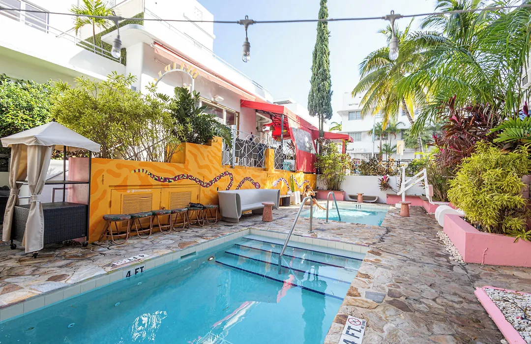 A lush garden area allows guests to relax in an inviting atmosphere around the pools. Viajero Miami offers coworking spaces for business needs. The beach and local nightlife are easily accessible for entertainment.