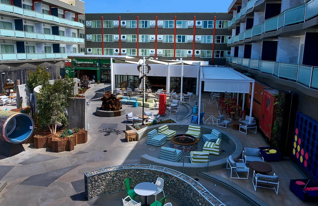 The centerpiece of Hotel Zephyr is 'The Yard,' an outdoor space with fire pits, shuffleboard, and giant games designed for families. Guests can enjoy access to the indoor game room, which offers a pool table and interactive art.