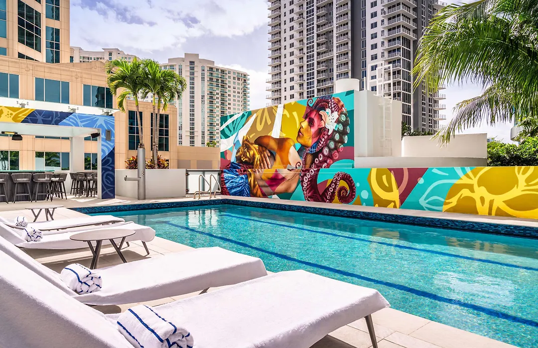 Leisure amenities include the outdoor swimming pool and fitness center, along with complimentary bike rentals for those interested in cycling around Fort Lauderdale. The hotel's design incorporates colors and textures reminiscent of coastal life.