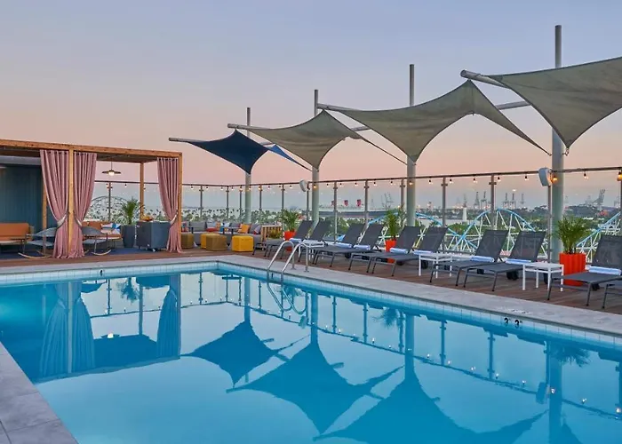 Hyatt Centric The Pike Long Beach, a 4-star hotel with an 8.6/10 rating, features a rooftop pool with views of the harbor and Los Angeles River. The hotel includes amenities like a business center and complimentary wireless Internet access.