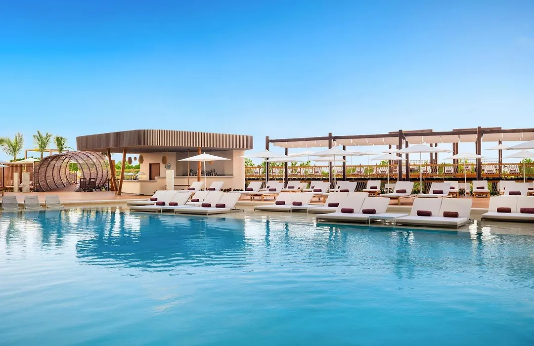 Hyatt Vivid Grand Island Cancun (Adults Only), a 5-star adults-only hotel with an 8.5/10 rating on Booking.com, features luxurious amenities and an outdoor swimming pool. Guests enjoy free WiFi, room service, and an on-site restaurant. The hotel is situated in Zona Hotelera, known for its all-inclusive resorts and relaxing sandy beaches.