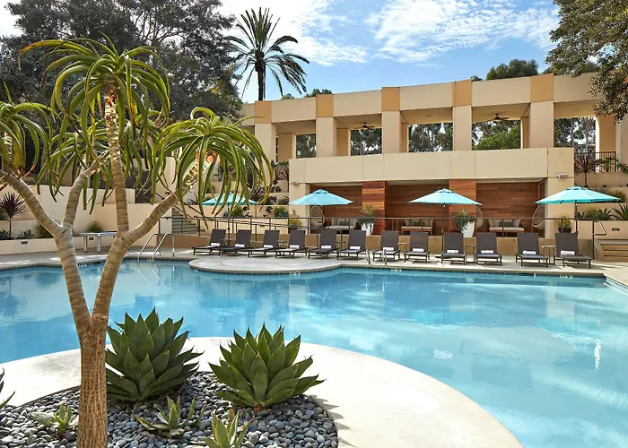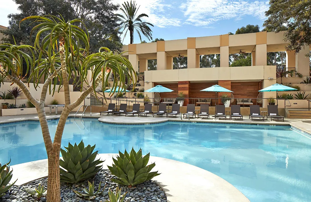 San Diego Marriott Mission Valley, a 3-star hotel rated 7.9/10 on Booking.com, offers a modern design with amenities such as an outdoor pool featuring a waterfall and a fully equipped fitness center. This family-friendly hotel boasts on-site dining at the DEN Restaurant and easy access to local attractions.