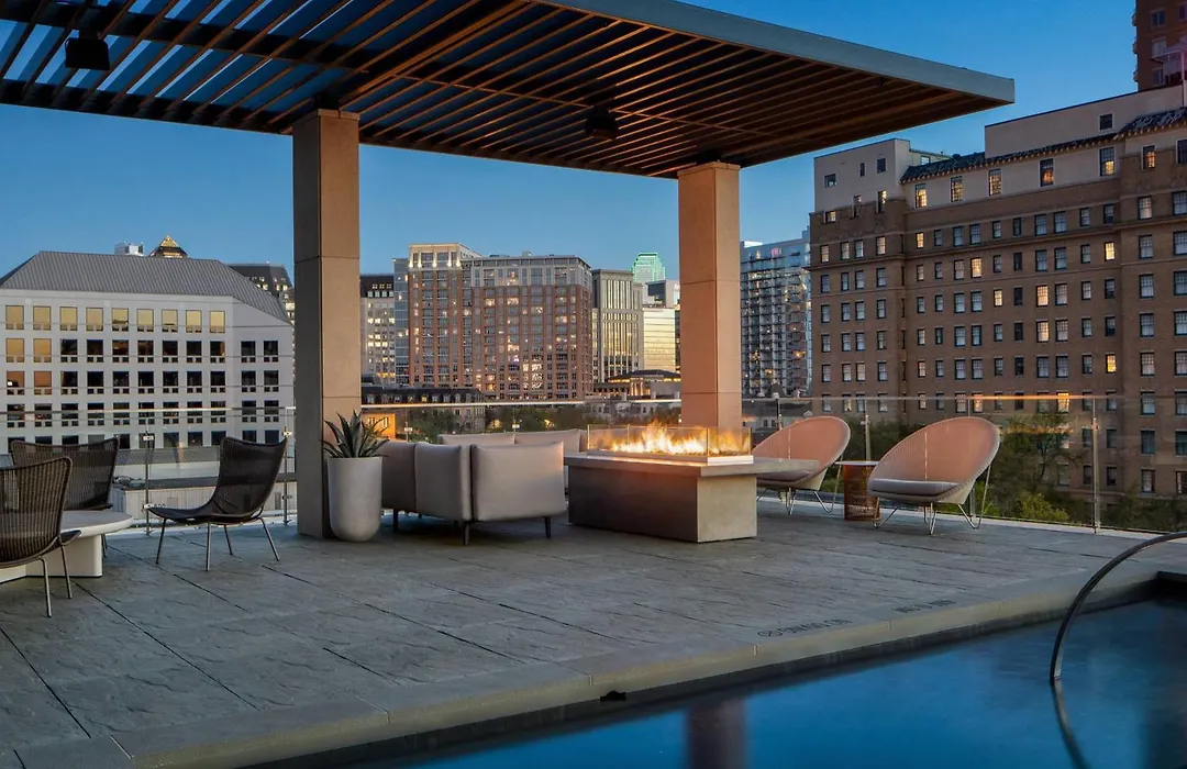 Leisure amenities include a rooftop outdoor pool and a recreational 24-hour fitness center. Guests can unwind and recharge after a busy day exploring downtown Dallas.