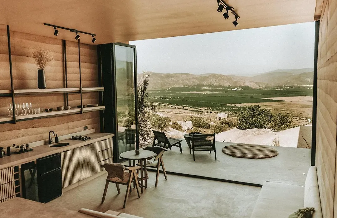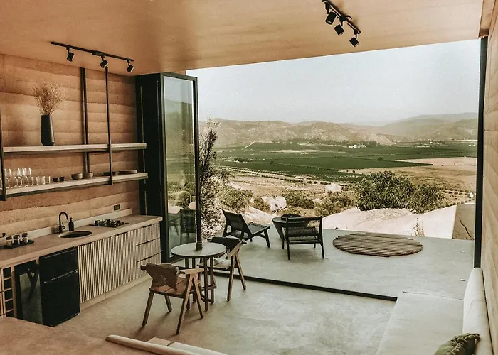 Mira Earth Studios, a 5-star Valle de Guadalupe hotel with a 9.9/10 rating on Booking.com, features luxurious studios with mountain views and private hot tubs. Guests can access complimentary Wi-Fi, free self-parking, and a sauna.