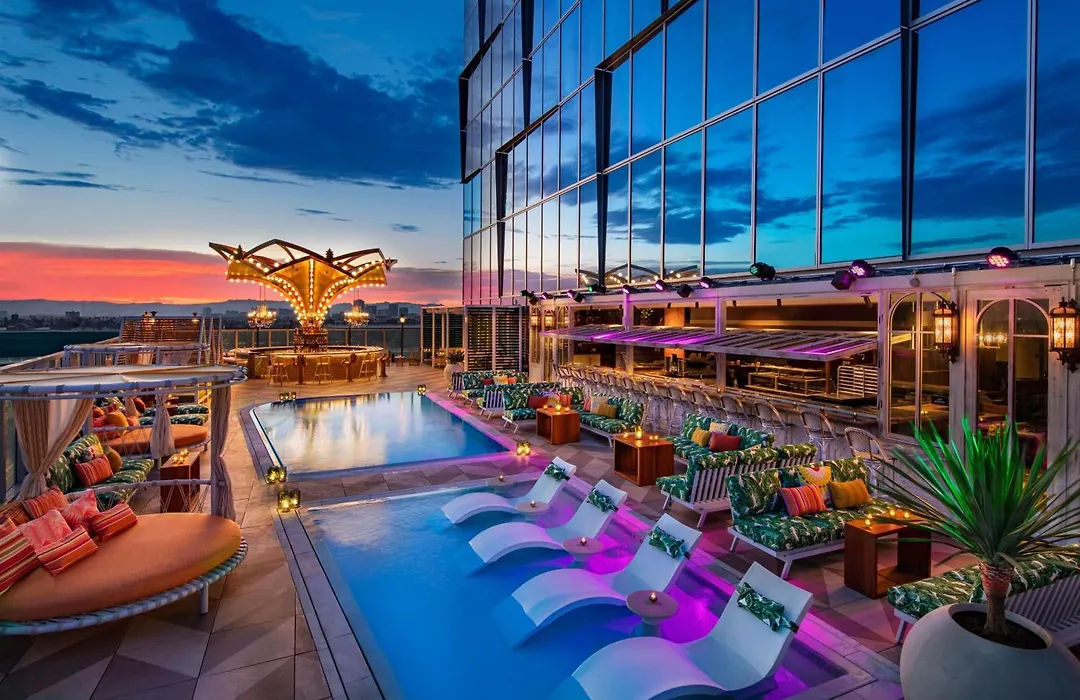 Dining options include a restaurant serving Argentinian and Japanese dishes, along with a rooftop bar on the 34th floor, providing expansive views of the Hollywood Hills. Level 8 offers a collection of various restaurants and lounges highlighting diverse cultures and cuisines.