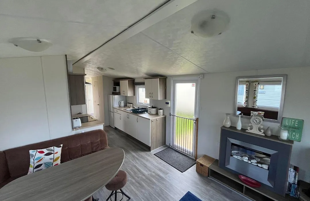 The mobile home at Ormesby Beach Haven includes four bedrooms, a flat-screen TV, and a fireplace. The fully equipped kitchen offers cookware, a stove, and a refrigerator. A private entry enhances the convenience of the stay.