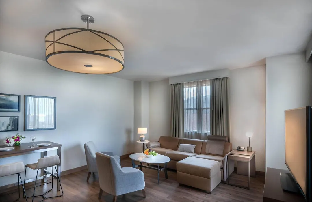 The hotel provides 233 guest suites that include sectional sofas, ergonomic desks, and fully equipped kitchens featuring refrigerators, microwaves, and dishwashers. Guests can enjoy amenities such as free wired Internet, Smart TVs with cable channels, and separate bathroom spaces.