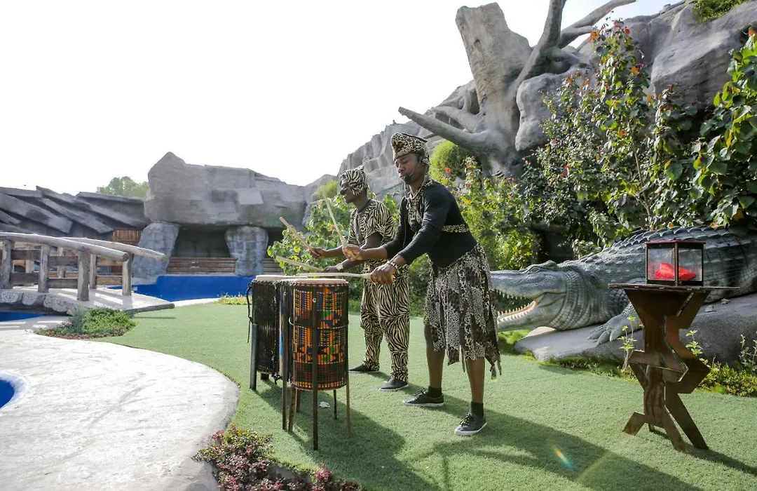 Emirates Park Resort features an outdoor swimming pool with slides, providing entertainment for families. Guests can engage in unique wildlife experiences, such as giraffe feeding and animal talk sessions, as well as VIP activities like breakfast with giraffes.