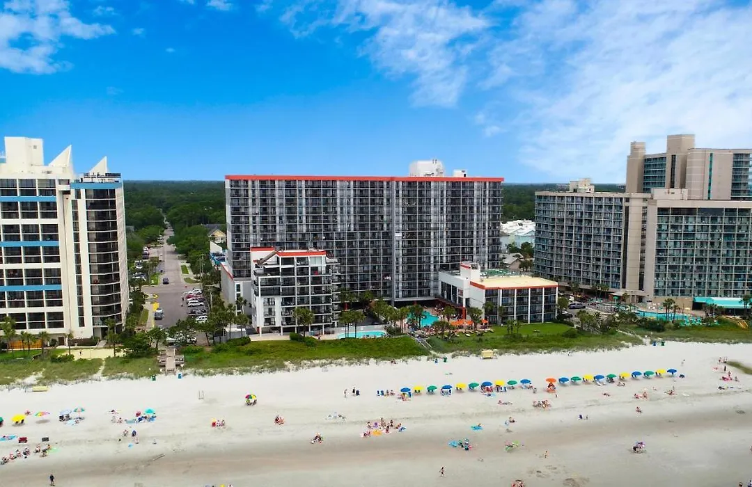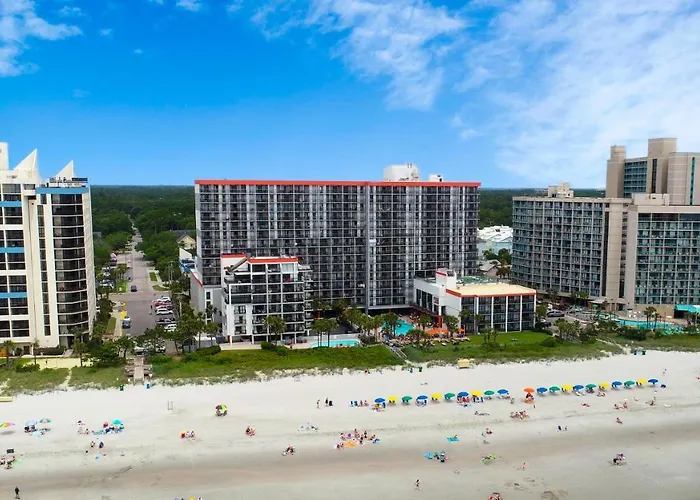 Grande Cayman Resort, a 3-star Myrtle Beach hotel with a 7.6/10 rating on Booking.com, features a beachfront location with both indoor and outdoor pools, including a 250-foot lazy river. The hotel offers complimentary WiFi and a sunbathing area with lounge chairs.