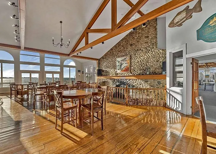 Dining options encompass The Restaurant on the Knoll, featuring cathedral ceilings and impressive fireplaces, and the Sandbar Lounge for cocktails and appetizers. Guests can dine overlooking West Lake or on the beachside patio.