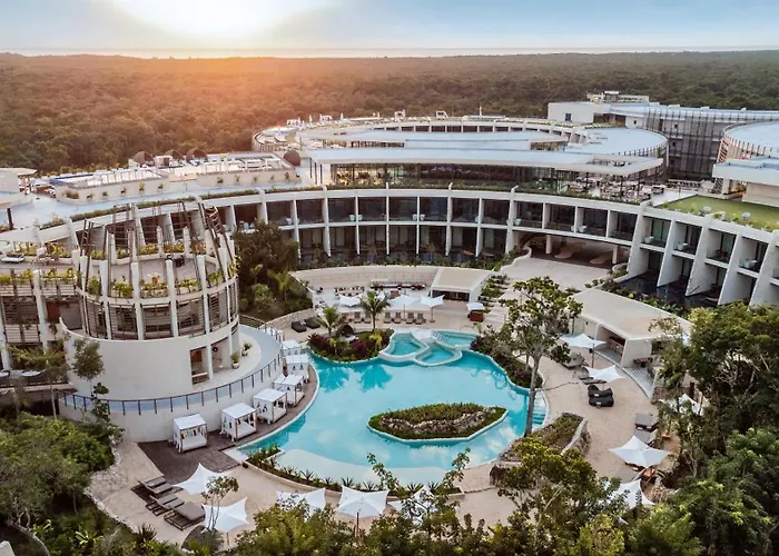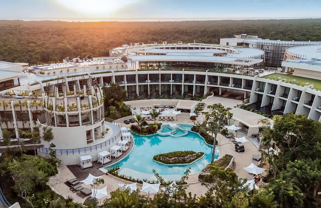 Secrets Tulum Resort & Beach Club (Adults Only) is a 5-star luxury hotel featuring 300 suites, an exclusive beach club, and a variety of amenities including a fitness center, a bar, and a restaurant serving Mediterranean cuisine. Guests can enjoy a mix of jungle and beach accommodations, emphasizing both seclusion and elegance.
