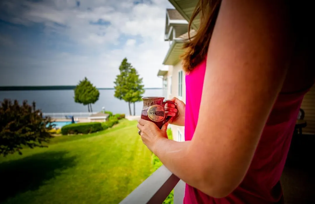 Westwood Shores features spacious guest suites with updated furnishings, private covered balconies, and fully equipped kitchens. All suites include gas log fireplaces and large smart TVs for a home-like stay by the bay.