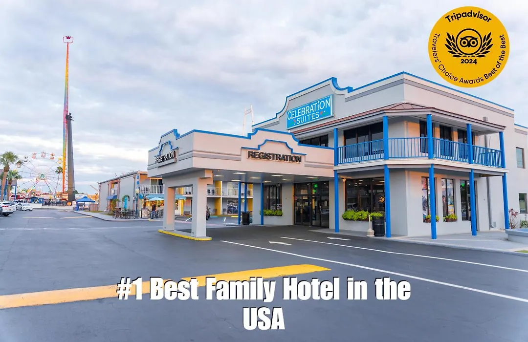Celebration Suites, a 3-star hotel with a 9.1/10 Booking.com rating, features spacious suite-style accommodations ideal for families. On-site amenities include three outdoor pools, a fitness center, and a café offering freshly made breakfast options.