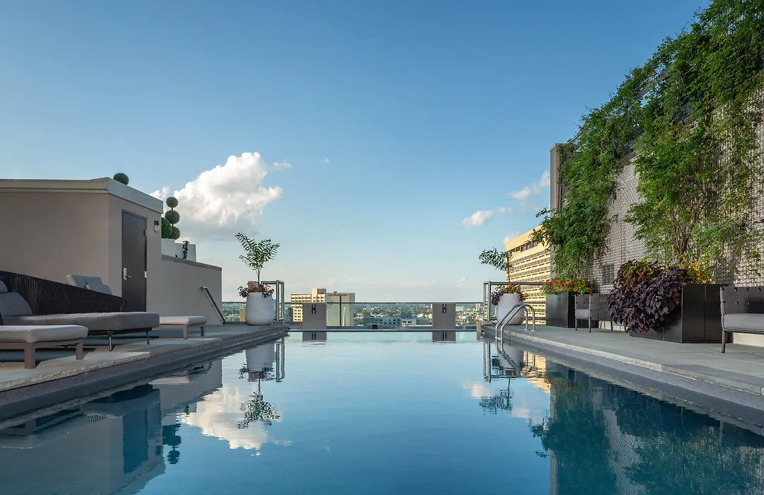 The Windsor Suites offers an all-suite experience with a 4-star rating and an 8.4/10 score on Booking.com. This Philadelphia hotel features spacious accommodations with fully equipped kitchens and skyline views, along with an expansive rooftop terrace and heated infinity pool.